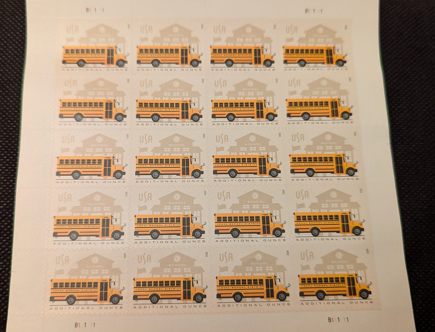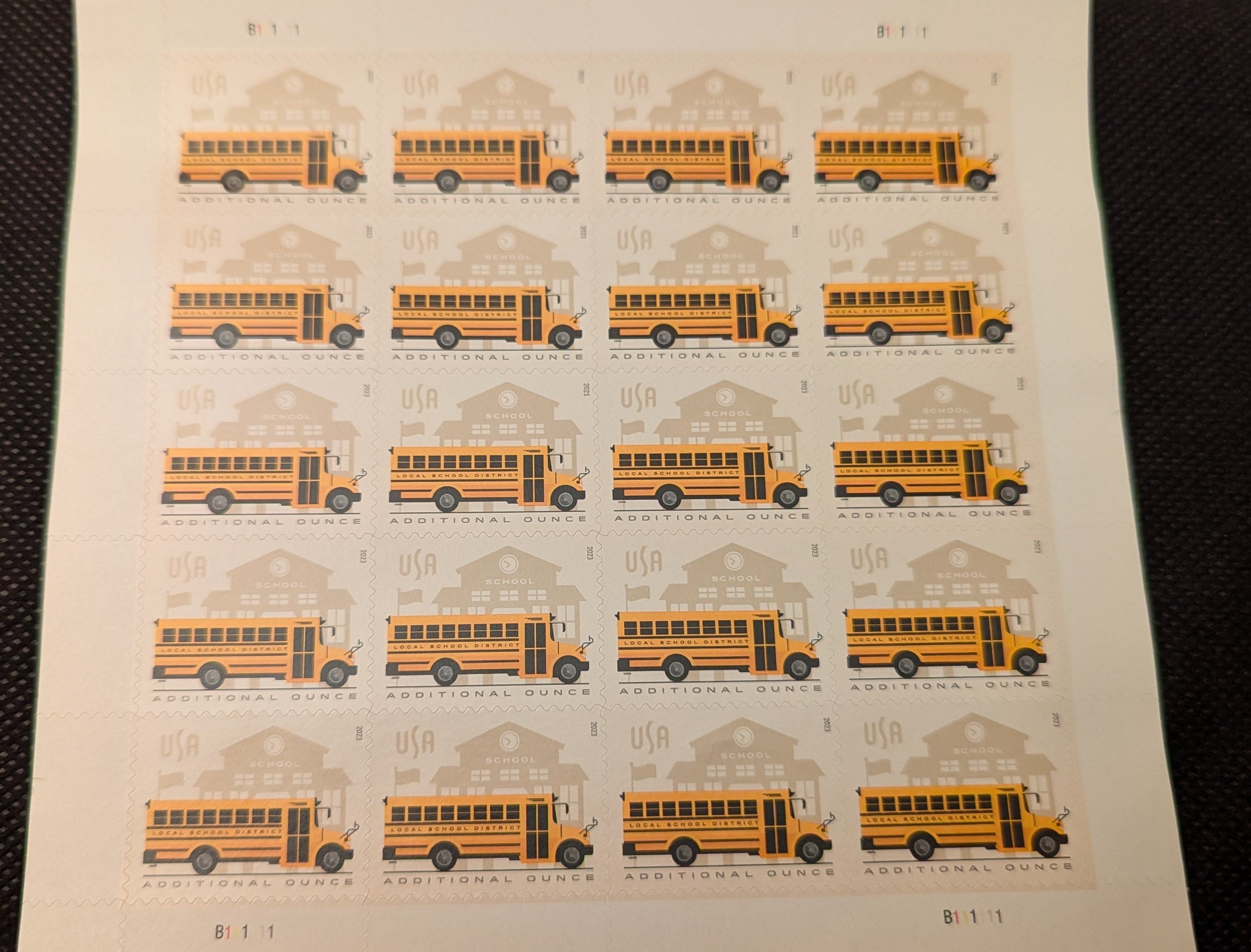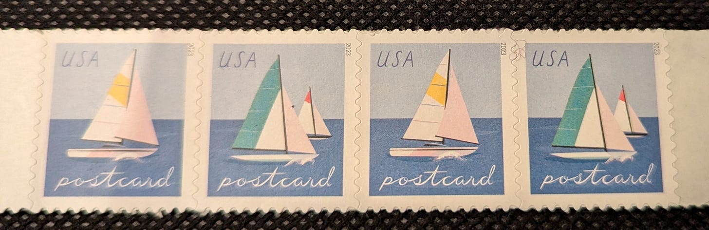 A late tax refund from the state is paying for our stamps. Postcard postage is 56 cents, but the standard postcard stamp is of a series of sailboats.